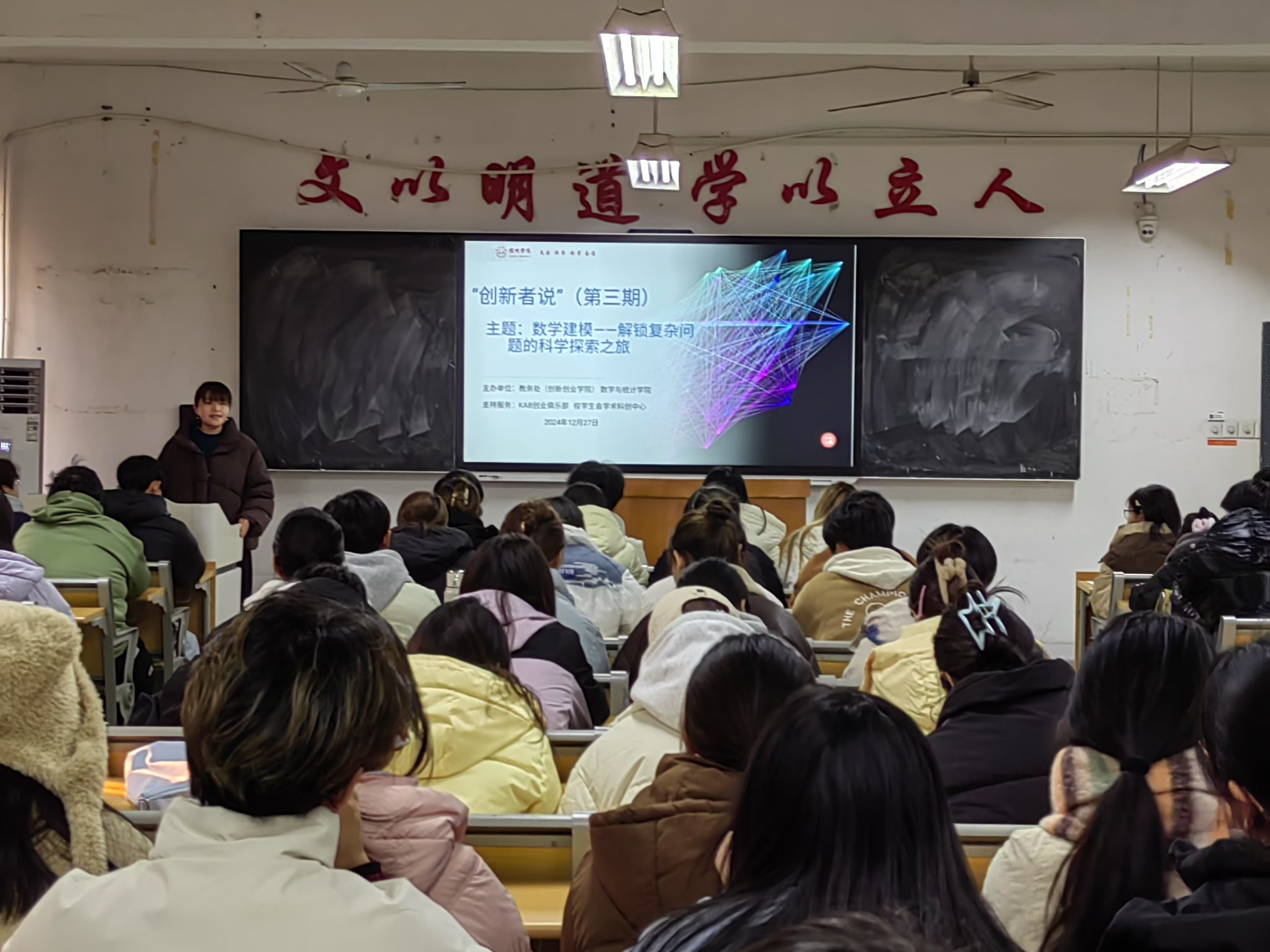 2024年12月27 日,我校第三期“创新者说”学术活动在教学B楼103举办。数学与统计学院相关负责人;第三期“创新者说”讲座教师;教务处(创新创业学院)工作人员;创新者联盟成员与相关学院同学100余人出席活动。