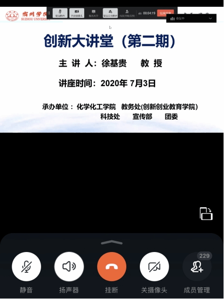 2020年7月3日晚8:00,化学化工学院在“钉钉”组织开展了青年创新大讲堂在线课堂,徐基贵书记做了题为发现“化学之美”,建设“美丽中国”的主题讲座,化学化工学院2018级,2019级全体同学参加。