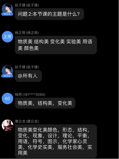 徐基贵书记首先从化学之美在于化学物质美、化学之美在于化学结构美、化学之美在于化学变化美、化学之美在于化学实验美、化学之美在于化学理论美、化学之美在于化学家的心灵美、化学之美在于化学史实美、化学之美在于服务社会美、化学之美在于其自我修正美,这九个方面向同学们介绍了本次讲座的主要内容,并提出探究 “ 化学无处不含美,但美在何处? ” 这个问题的重要性。接着徐基贵书记从这九个部分展开了深入的、全面的讲解,并一一举出实例和播放实验视频充分论证了化学无处不含美,理解与感受化学之美有助于同学们对化学更好的理解与探索。讲座最后徐基贵书记向同学们提出了两个问题:化学之美有哪些美?本节课的主题是什么?同学们就这两个问题做了认真的讨论与回答,在本次美育大讲堂中获益良多。