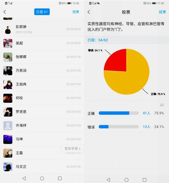 授课过程中,同时启用两个教学平台,即手机端学习通和电脑端QQ 群,以防上课高峰时期学习通出现网络拥堵打不开。根据学校通知,提前 在学习通里发布签到任务;在上课期间,通过学习通督促学生开始观看课程教学视频,并围绕本次课学习内容组织学生进行主题讨论、发放问卷、投票等形式。在上课期间,告知学生如若学习通打不开,立即启用第二套 线上教学平台——班级QQ群,采用点名提问、集体回答以及群投票的方式 进行教学互动。