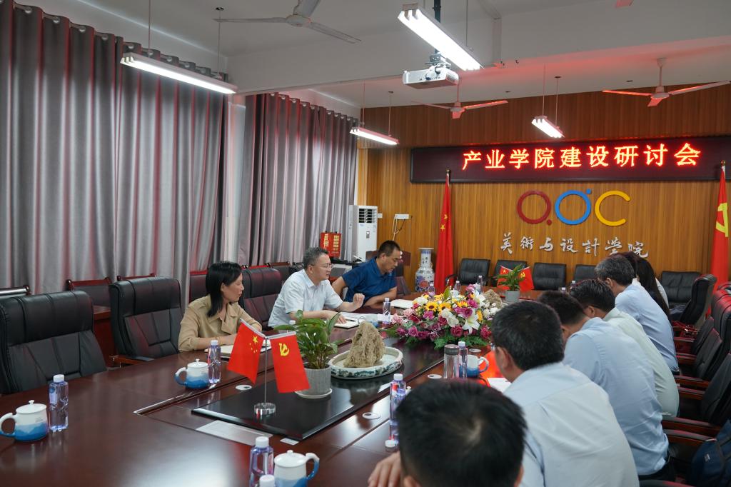 走访后,院领导、教务处负责人、5个学院的负责人和产业学院的负责人在美术与设计学院会议室召开了产业学院建设研讨会,研讨会由李亮主持。会上,学院负责人围绕产业学院建设进展、现实问题、工作计划逐一做了汇报。王红艳针对深入做好教育教学综合服务,全力支持各产业学院建设做了表态发言。