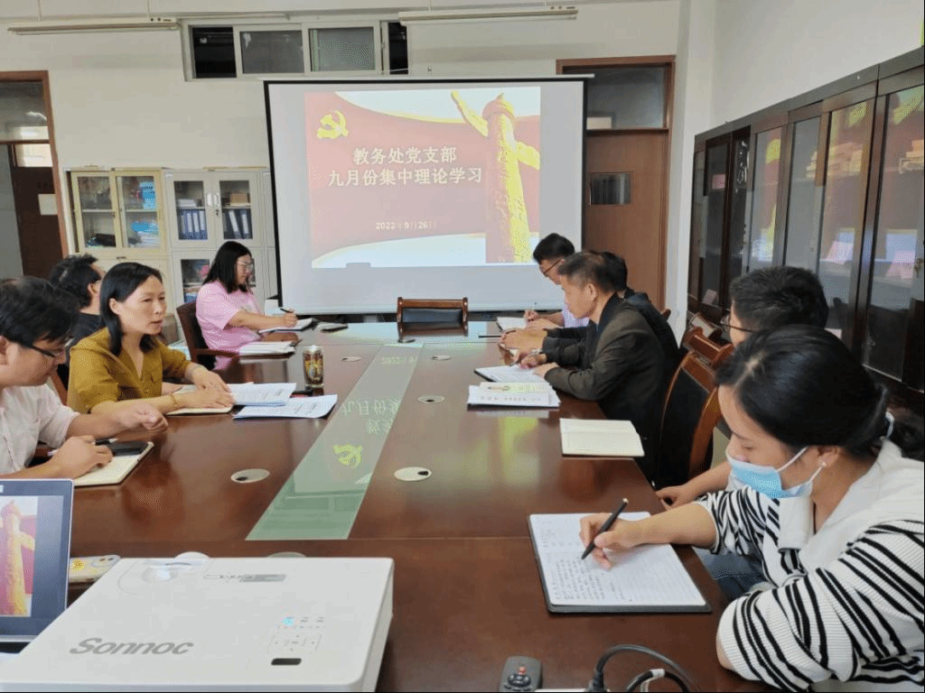 9月26日下午,教务处党支部在逸夫楼A202开展集中理论学习。党支部书记王红艳主持会议,教务处全体人员参会。