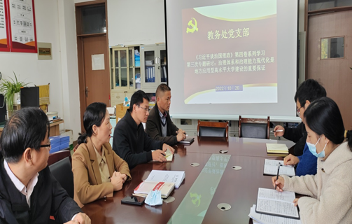 10月26日上午,教务处党支部在逸夫楼A202开展《习近平谈治国理政》第四卷系列学习及第三次专题研讨:治理体系和治理能力现代化是地方应用型高水平大学建设的重要保证。会议由党支部书记王红艳主持,教务处全体人员参会。