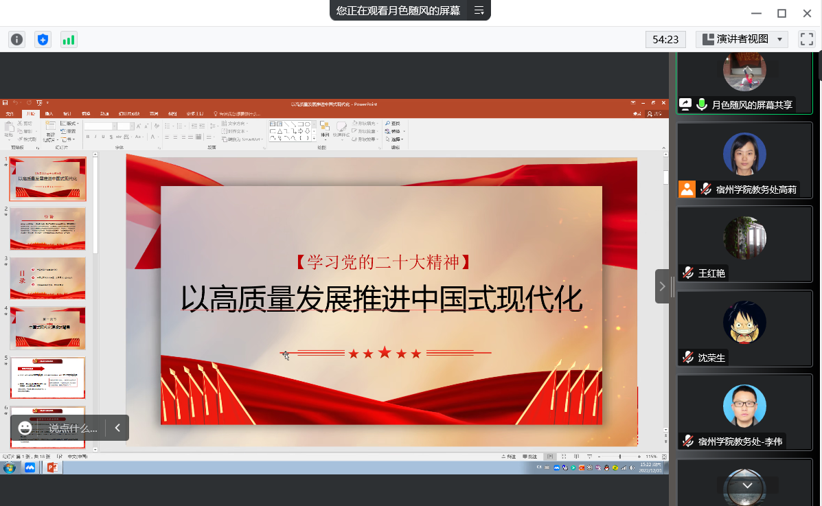 接着,刘超为大家上学习党的二十大精神-以高质量发展推进中国式现代化的专题党课。全体人员要认真学习二十大精神并与本职工作结合起来,用以指导工作。深刻理解习近平新时代中国特色社会主义思想的精神实质,结合实际将自己的本职工作精细化,切实将这一思想贯彻落实到推动工作开展的全过程和各个方面,促进学校的高质量发展。