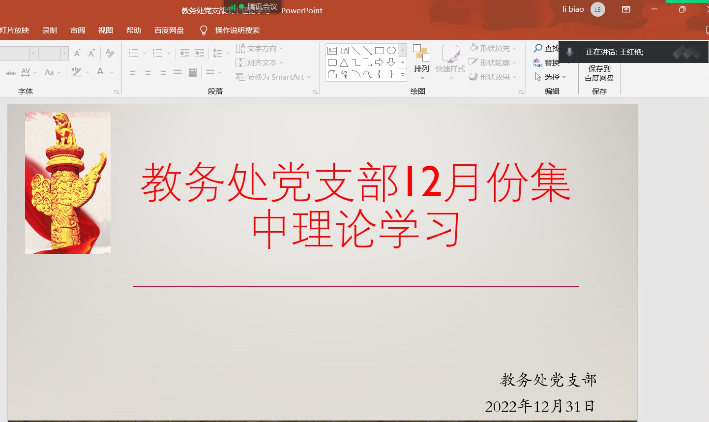 12月31日,教务处党支部开展线上集中理论学习。党支部书记王红艳主持会议,教务处全体人员参会。