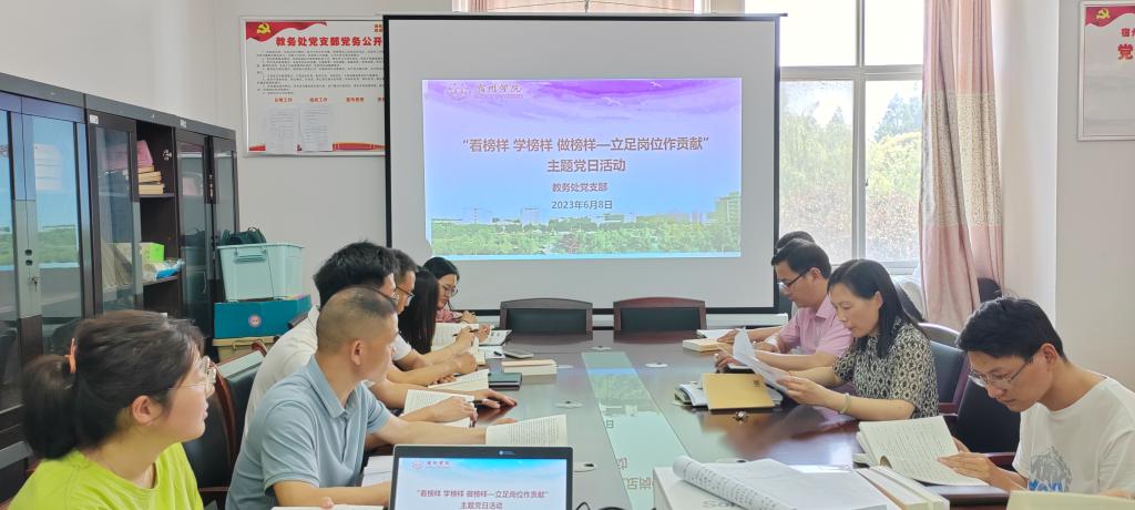 6月8日,教务处党支部在逸夫楼A202会议室开展“看榜样 学榜样 做榜样--立足岗位作贡献”主题党日活动。活动由党支部书记王红艳主持,支部全体成员参加活动。