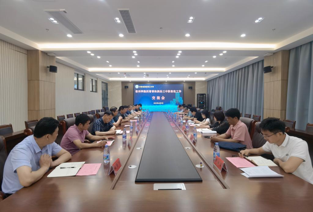 6月9日上午,我院教务处副处长唐永刚一行到安徽省泗县第三中学,就县中托管帮扶阶段性工作进行交流。泗县三中党委书记、校长刘永,党委委员、党委副书记程先敏,校党委委员、副校长董丙杰及相关部门主要负责人,我院组织部、教务处、发展规划处、团委、学生处、继续教育学院等部门相关负责人参加工作交流。会议由泗县三中团委书记杨广主持。