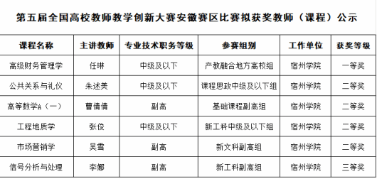 近日,由安徽省教育厅主办的第五届全国高校教师教学创新大赛安徽赛区比赛圆满落幕。我校选派的6名教师(团队)在众多参赛者中脱颖而出,斩获佳绩,获得一等奖1项、二等奖4项和三等奖1项。
