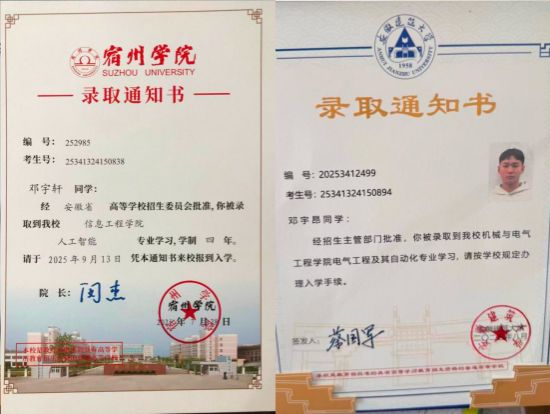 在宿州学院2025年迎新生的温暖浪潮中,一位新生的到来承载着更多的关注与期望。他便是来自安徽省泗县的双胞胎兄弟之一——邓宇轩同学,他与孪生哥哥邓宇昂分别以优异的成绩被我校人工智能专业和安徽建筑大学电气工程及其自动化专业录取。兄弟俩的成功升学,不仅是一个家庭的喜悦,更是一段由我校与安徽建筑大学通过联合招生宣传促成的佳话。