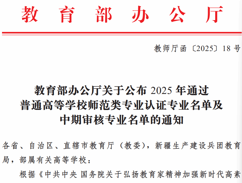 近日,教育部正式发布了《教育部办公厅关于公布2025年通过普通高等学校师范类专业认证及认证中期审核专业名单的通知》(教师厅函〔2025〕18号),我校体育教育专业通过了教育部师范类专业中学教育第二级认证,认证结论有效期六年,自2025年9月起至2031年8月止。这是我校体育教育专业在教育教学质量上取得的重要里程碑,也是对我校师范类专业建设成效的充分肯定。