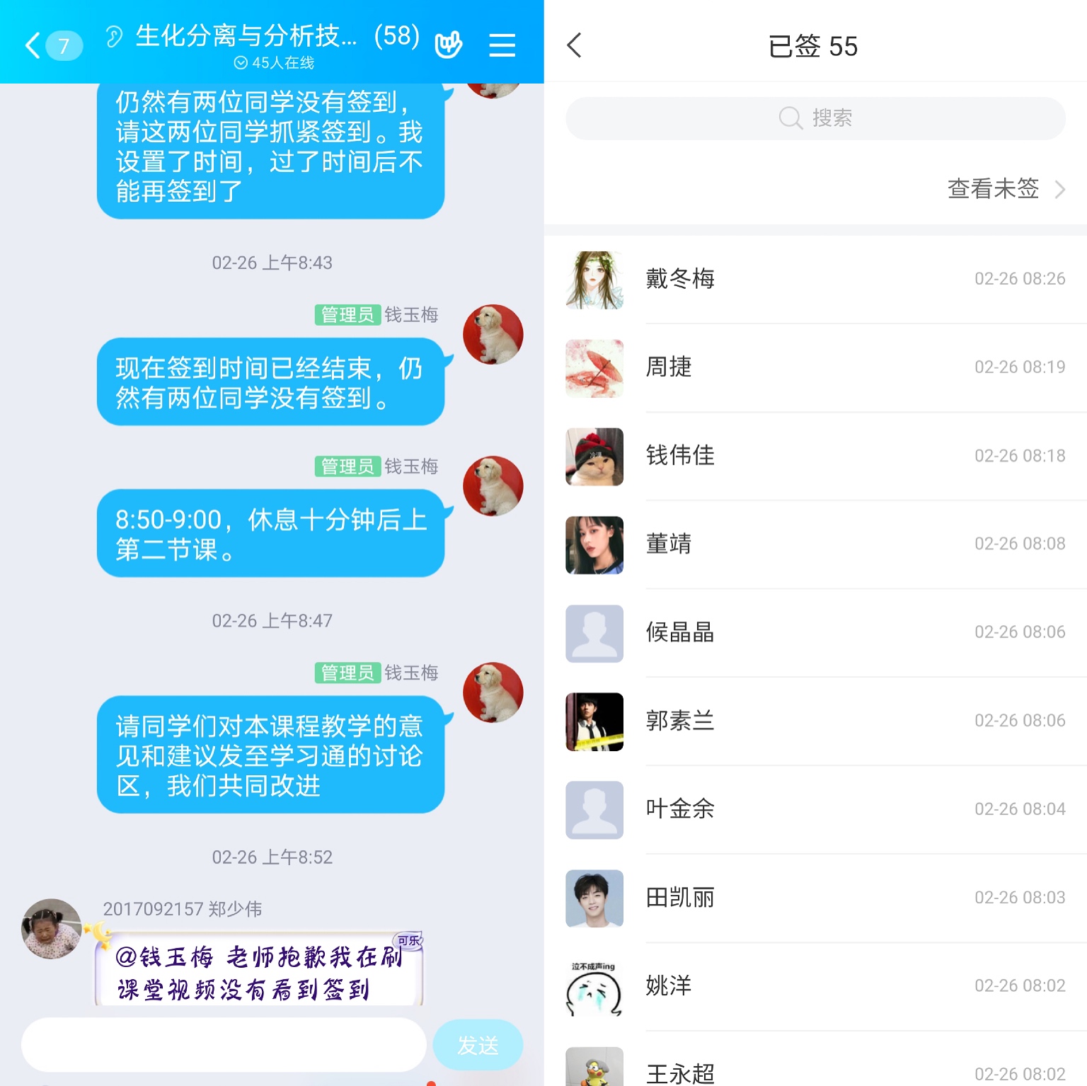 采取多种形式,督促学生上线学习,提升到课率。错开高峰提前15分钟签到,并把签到时间适当延长,有些特殊情况可以采用QQ反馈等进行补签,保证100%到课率。例如,17生物技术1班100%到课率(55人签到,有2人没有签到已经在QQ做出说明)。
