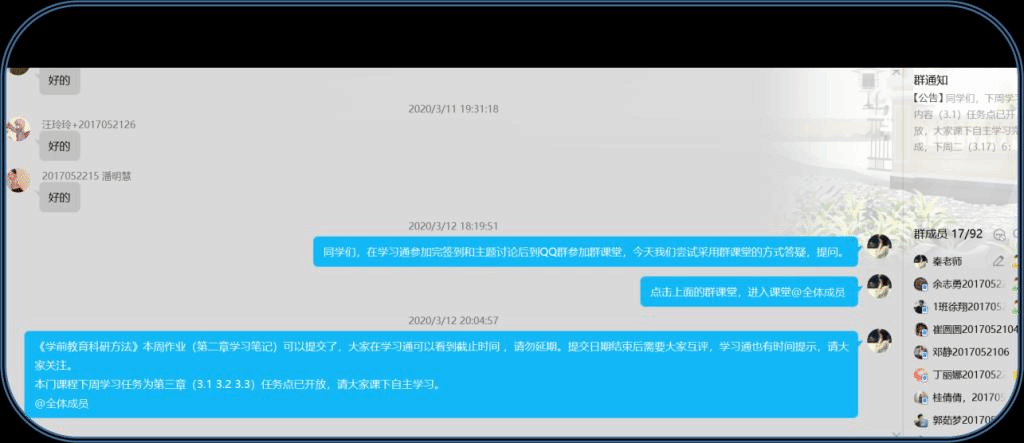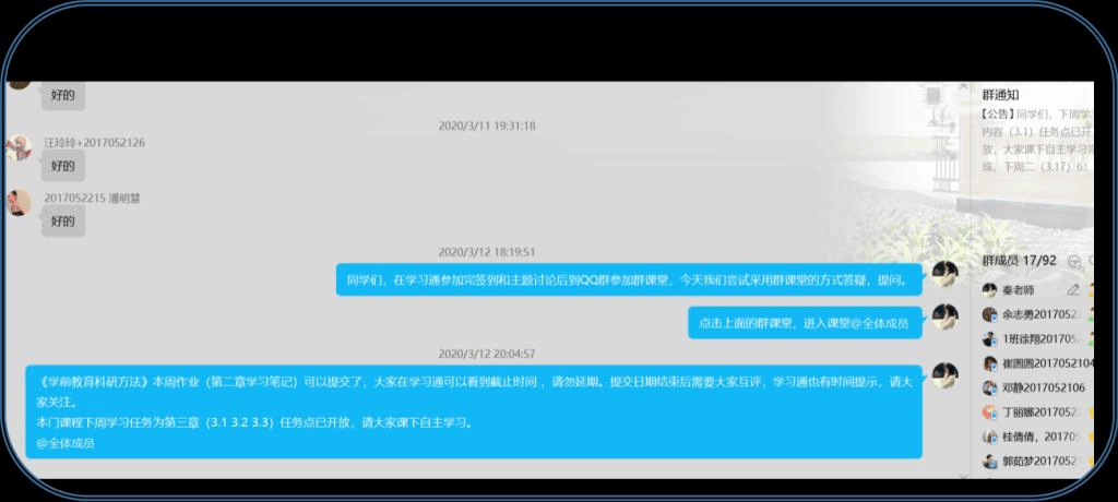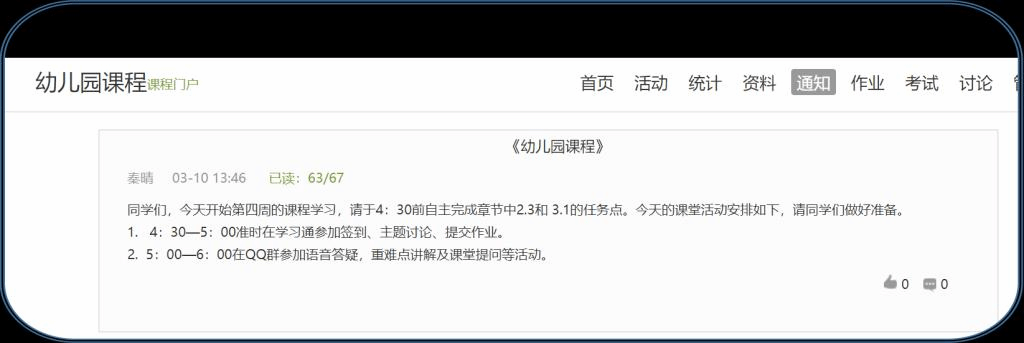 1.发布通知:为避免学生出现迟到现象,甚至错过学习时间,开课前发布通知,内容包括:教学安排,学习渠道,学习方法等,通知到位,确保每一位学生知情,明确一周的学习安排。