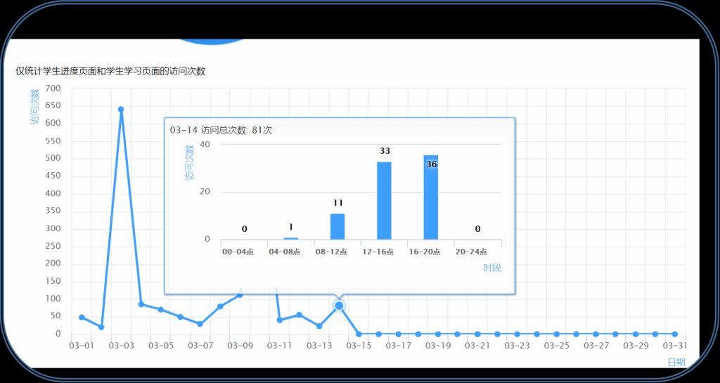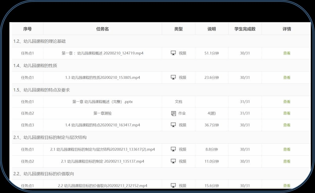 在线教学没有集体学习的氛围,视频录制应以微课为主要形式,聚焦某一个知识点,或者某一节内容,讲清讲透,时长控制在20分钟左右。在线教学不能照搬以往的课表,要根据在线教学的优势和劣势进行调整和创新。明确学生的学习任务,利用超星学习平台视频的防拖拽功能监控学生端窗口,并通过统计数据做好对学生学习任务的检查与督促。