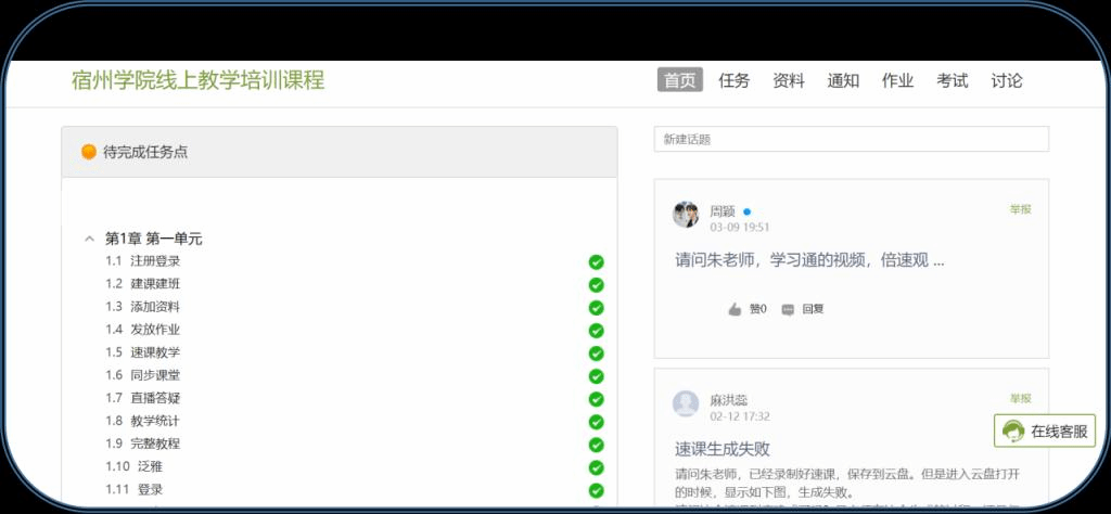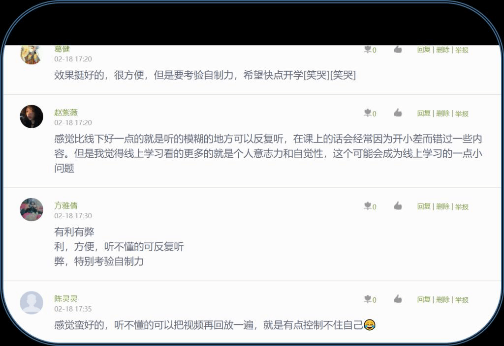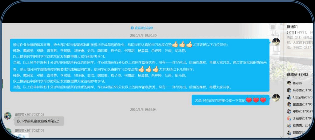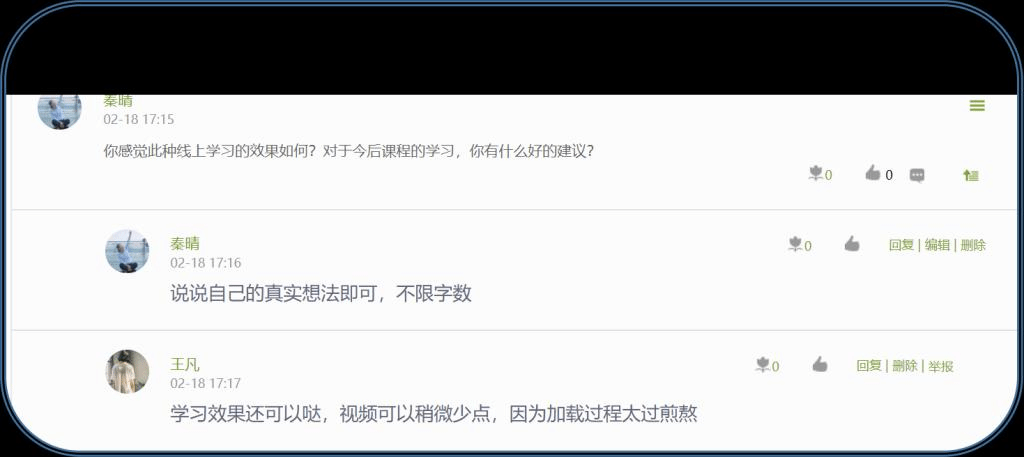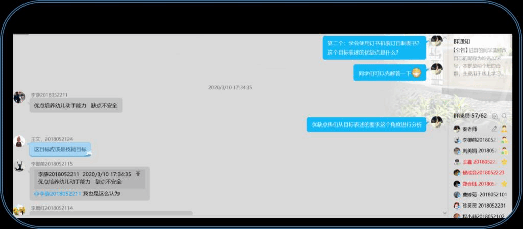 3.学习有法:学生不知道如何进行线上学习,学习效率低怎么办?教师可以在课程学习前将课程说明、学习目标、学习流程以及注意事项等内容录制为学习指导视频,必要时配合屏幕截图,请学生提前观看。鼓励学生学习时提出问题,带着问题听课。2-3次课后,邀请优秀同学分享学习经验和方法,一段时间之后整理学习攻略,大家一起分享。要求学生做好笔记,并拍照分享,通过做笔记的方式促进思考,通过平台中学生在线学习数据,如在线时间、有无回看等消息及时了解学生学习状态。