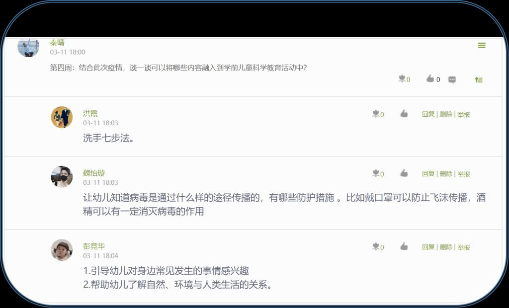 5.互动有效:交流环节成效不高,学生们参与情况不均衡?在使用超星学习平台的主题讨论时,会发现学生经常有雷同跟帖现象,导致讨论效率不高。针对这一问题,教师尽量设置开放性思考题,不必总是在第一时间回复学生的每一个问题,给学生自主思考的时间和机会,提醒学生重视不同意见。讨论结束时,教师需要总结大家的主要观点以及存在的主要问题,同时肯定并鼓励积极参与讨论的同学。