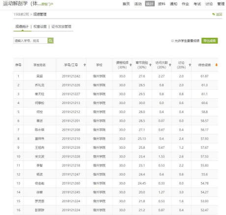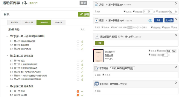 自接到线上授课通知,就开始着手准备《运动解剖学(二)》课程内容。根据教学目标,依托超星“一平三段”教学平台,开始建设《运动解剖学(二)》课程教学内容。建课过程中,通过各类教学软件,寻找最优质的教学资源,尤其是教学视频,不断丰富课程内容,完成课程的组织和设计。课程教学内容包括课件PPT、课程视频、电子版教材、网络图书、章节测 验、主题讨论以及各章节相关拓展资源等形式,并设置为任务点,以保证最基础的教学功能最大限度地得以实现。