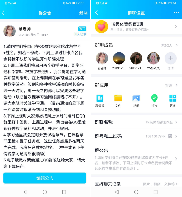 考虑到大量平台用户同步使用,服务器容量所限,综合权衡后,建立第二教学平台班级QQ群,并发布通知,告知学生线上开课 时间以及开课要求,同时告知学生线上课程序,明确线上学习的要求以及学生需要完成的学习任务。同时,在班级QQ群中也上传一份 课件、录课视频、电子教材等教学资料,并告知学生提前,以保障线上学习的学习效果。