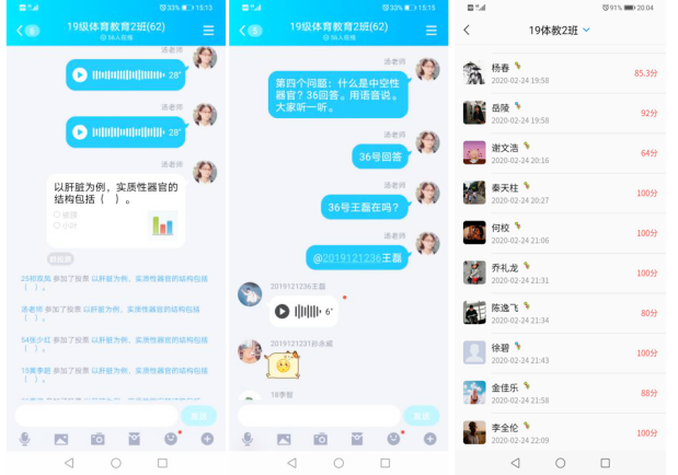 图11 班级QQ群进行语音讲解、群投票互动、班级QQ群进行点名提问以及学生章节测验成绩